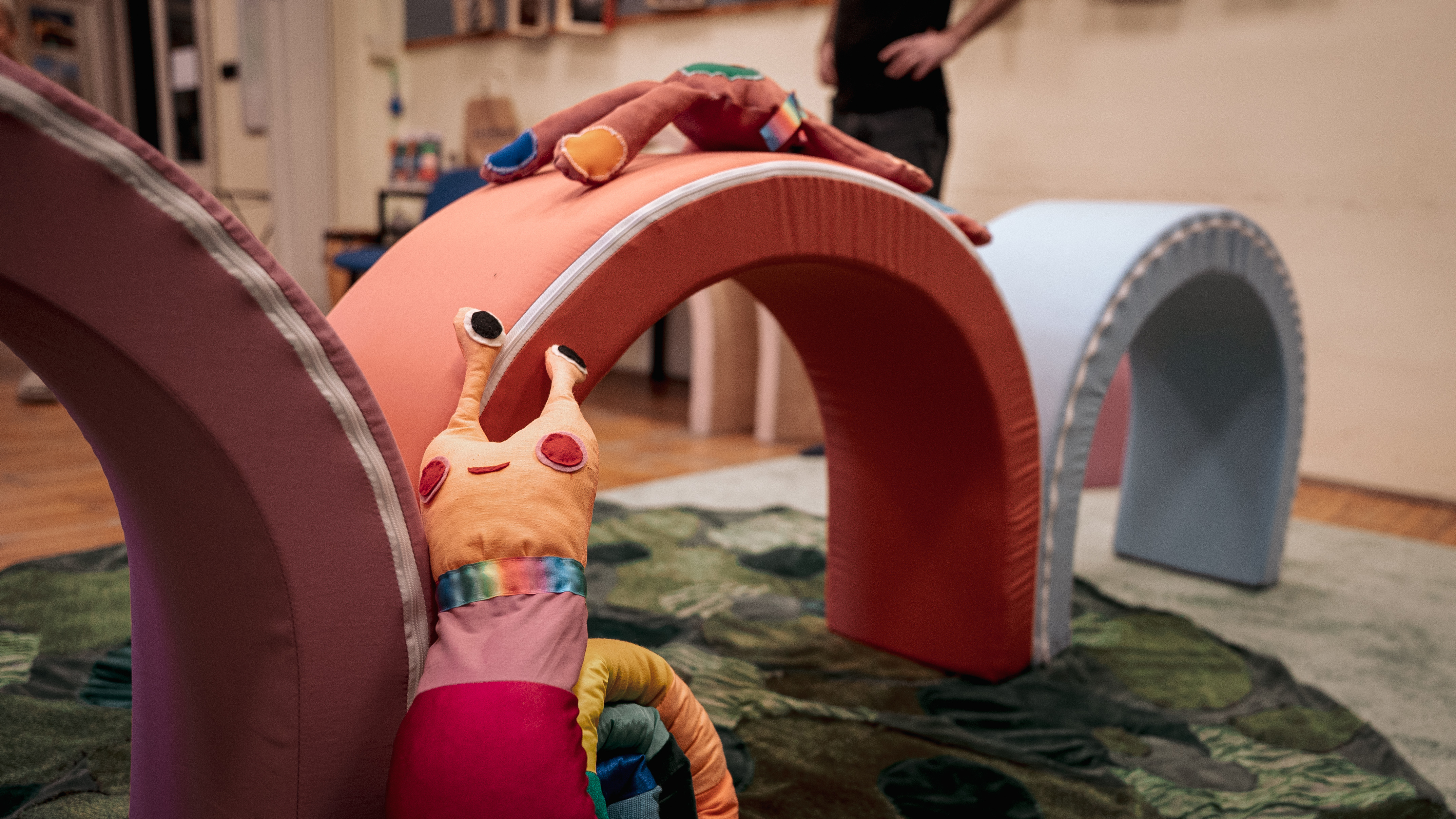 Az első alkalommal egy babaelőadást terveztem, ahol a kisebb befogadótér és korosztály miatt finomabb anyagokkal, színekkel és formákkal dolgoztam, minden puha volt és kerek, ezáltal egy intimebb teret teremtettünk. A Kis kukacológia egy nagyszínpadi show, vibrálóbb színpadképpel, fényekkel, zenével, és sok vicces szereplővel. A díszlet sokfunkciós, forog, világít, tekeredik, és közben nagyon élénk szín- és formavilággal operál.